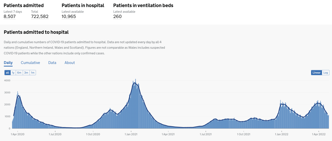 4月27日数据:目前住院的确诊新冠患者10,965人,累计住院新冠患者总数为722,582(+8,507)。