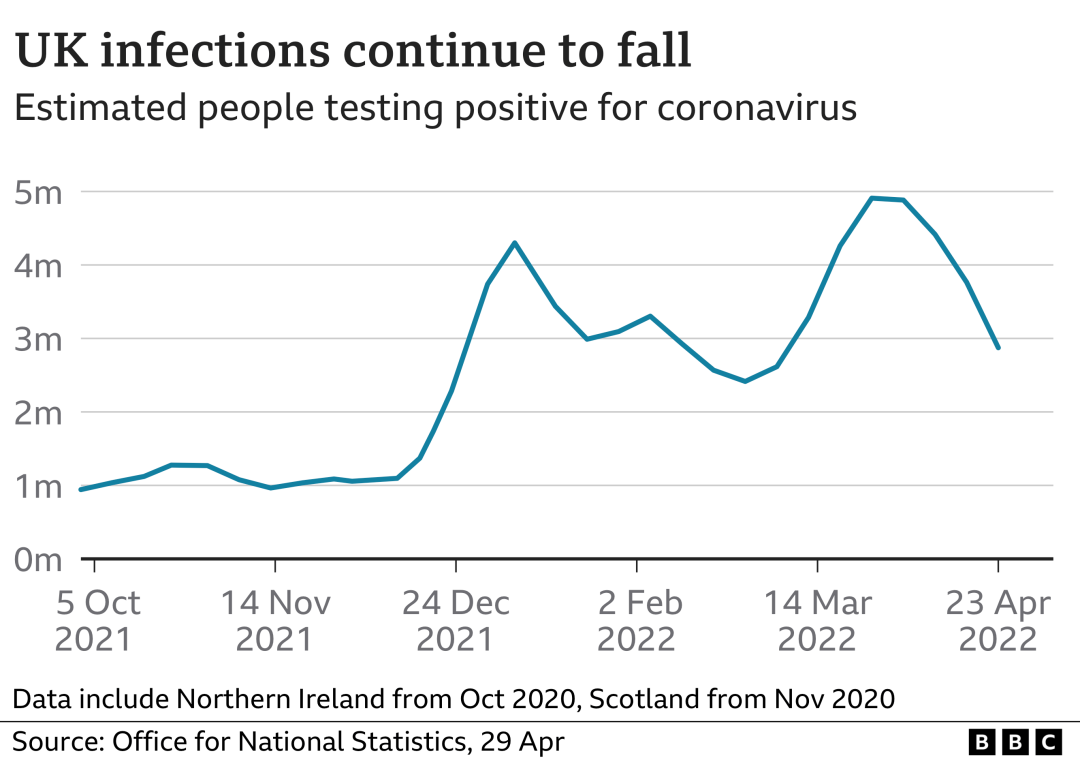 根据国家统计局(ONS)的最新估计,英国新冠感染人数出现了创纪录的下降。在截至4月23日的一周内,约有287万人检测呈阳性,比前一周减少了约90万人。是自2020年7月开始调查以来,出现的最大降幅。