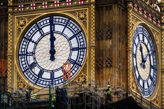 早前,在表盘手脚架拆除后,面向议会广场(Parliament Square)和圣詹姆斯公园(St James’ Park)的西面表盘都出现了时间误差。在4月29日经钟表机械专家将其与维多利亚时代的原始钟表装置成功连接后,重新校准了时间。