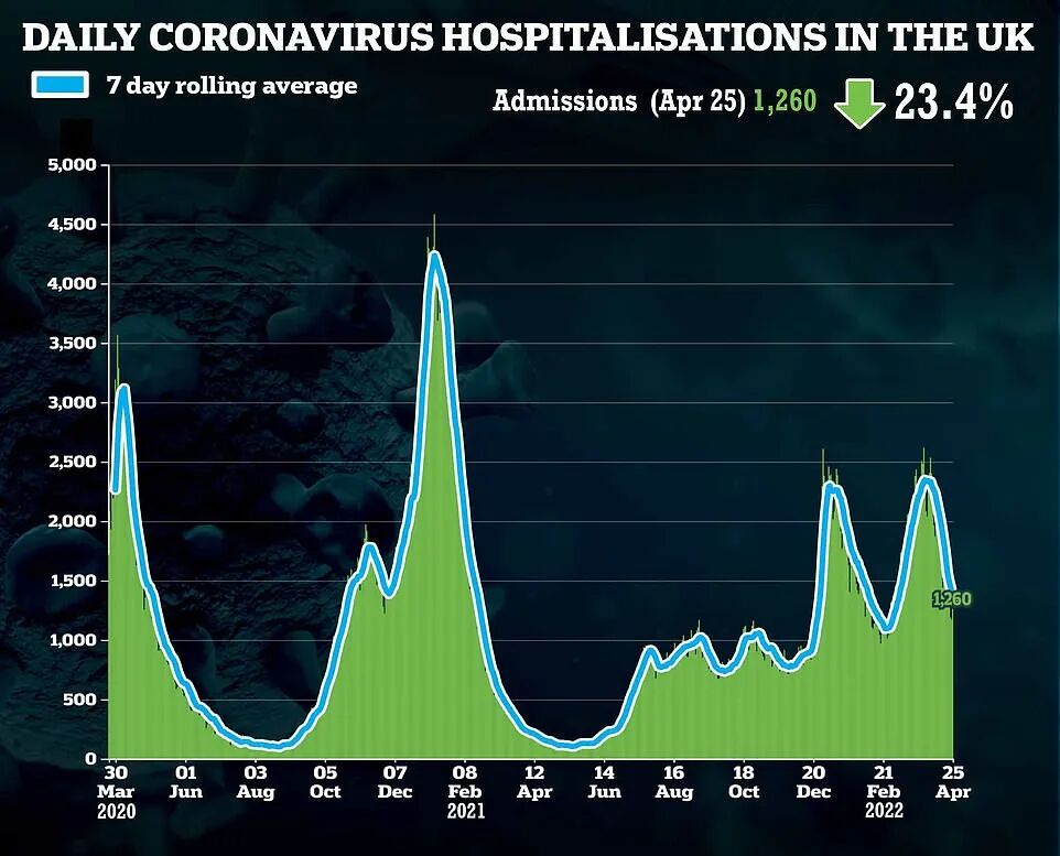 英国官方数据显示,因新冠入院的人数继续下降。住院人数已从3月底的近2,400人下降至每日约1,455人入院。