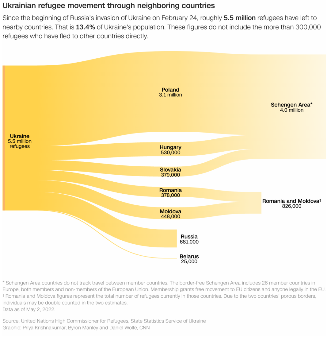 根据联合国难民事务高级专员(UNHCR)的最新数据,自2月底俄乌冲突开始以来,至少有550万人逃离乌克兰。其中300多万人前往波兰,超过80万人前往罗马尼亚。预计将有超过830万难民逃离乌克兰。