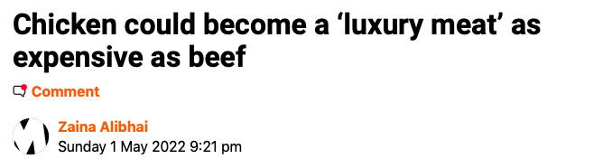 在过去一年中,饲养一只鸡的成本上升了近50%。根据国家统计局的数据,从2020年3月到2021年3月,鸡肉的平均零售价格每公斤增加了19%,而牛肉则上涨了3%。在英国,大多数牛都是喂草的,不需要高浓度的饲料。