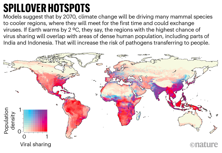 该研究预测,大部分新的病毒传播将发生在物种“首次相遇”时,尤其是因气温上升而迁往更凉爽的地方的过程中。并预测这将最可能发生在高海拔地区物种丰富的生态系统中,特别是非洲和亚洲地区,以及人类密集的地区,包括非洲的萨赫勒地区、印度和印度尼西亚。