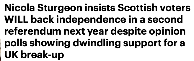 苏格兰部长Alister Jack在2021年9月建议,只有在民意调查持续发现60%的苏格兰人希望独立的情况下,才应该举行独立公投。