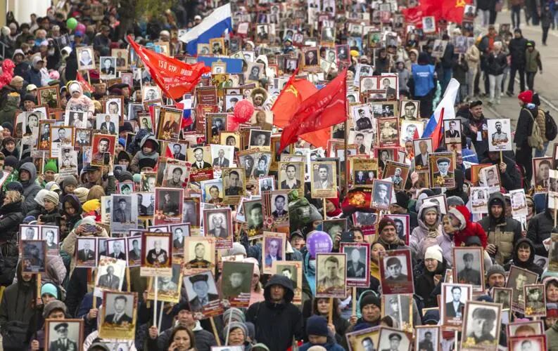 值得一提的是,俄民众当天手持参加过卫国战争的亲属的肖像举行“不朽军团”(Immortal Regiment)大游行,俄罗斯总统普京也在游行队伍中,手捧父亲肖像参加。