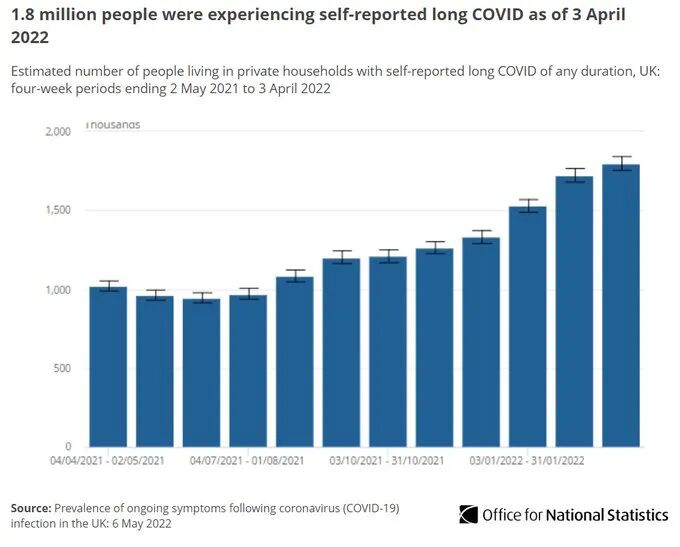 据估计,有120万人因长期新冠症状对日常活动产生了不利影响,约占自我报告患者的三分之二。其中疲劳仍然是最常见的症状(51%),其次是呼吸急促(33%)、嗅觉丧失(26%)、注意力难以集中(23%)。
