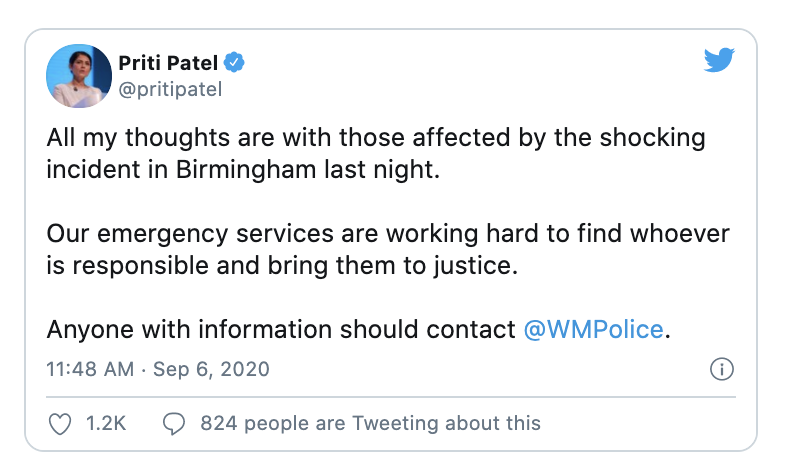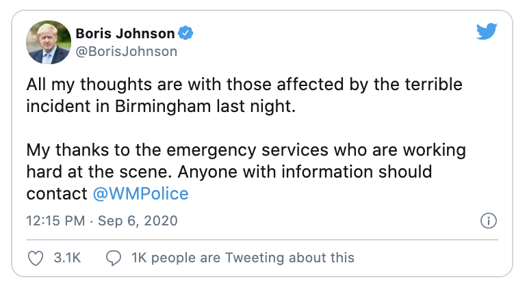 首相鲍里斯Boris Johnson今日在官推上对昨晚紧急救援人员发表了感谢,并表示“我与昨晚伯明翰刺杀事件的受害者同在。”
