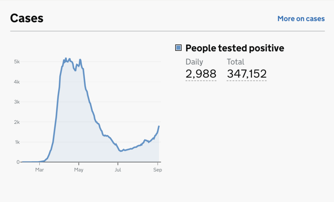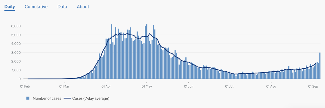 今日新增确诊暴增近3,000例——自5月23日以来单日最高新增。其中,米德兰、英格兰东北部和约克夏日增超过600例;英格兰西北部超过700例;威尔士新增98例,创自6月30日以来新高;北爱地区新增106例,自4月25日以来新高。