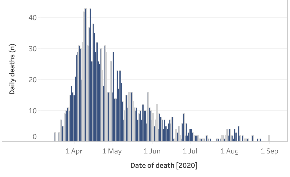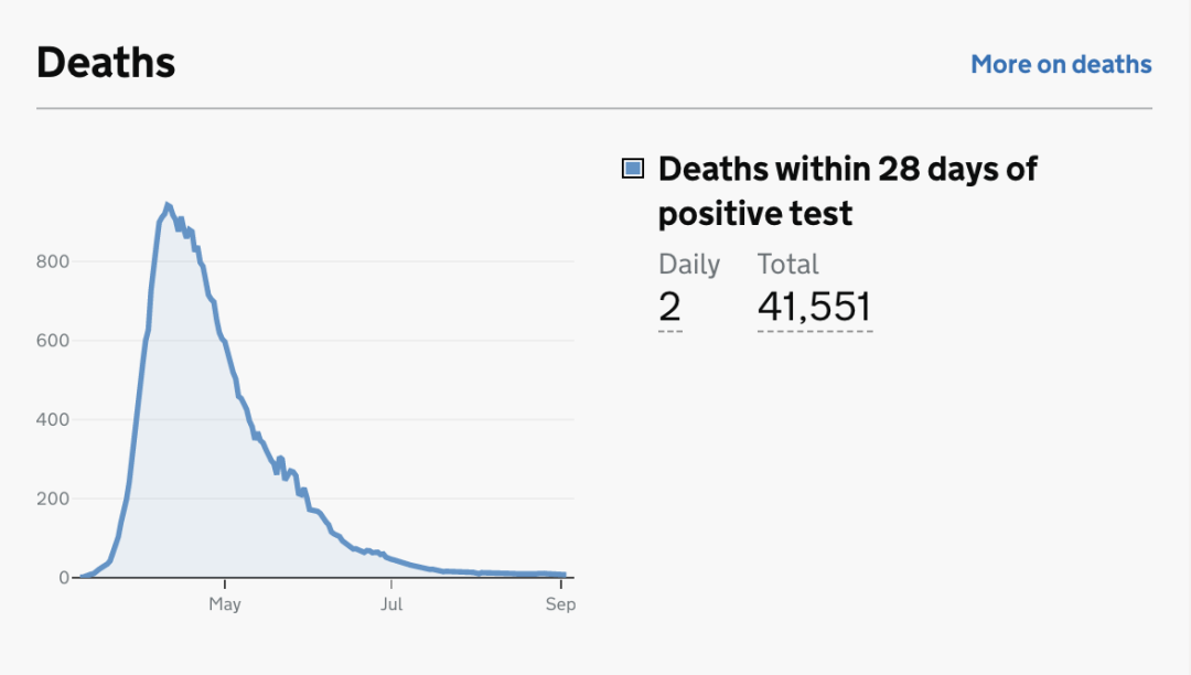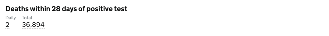 目前英格兰地区使用呼吸机的新冠患者有54人(*);病亡新冠患者总计36,894人(+2)。
