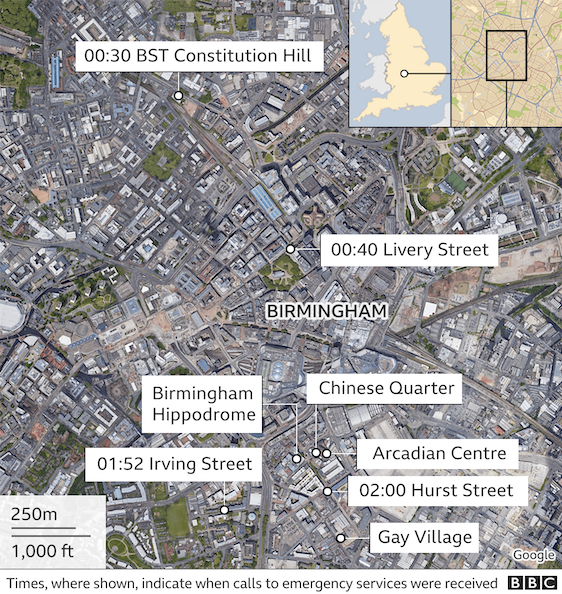 根据伯明翰警方叙述:第一起刺杀事件发生于当地时间00:30的Constitution Hill。随后凶手向南移动,并开始了无差别持刀行凶——在凌晨2:20左右,该凶手分别在Livery街、Irving街,最后在Hurst街,也就是市内同志村与华人区交汇之地刺伤了人。