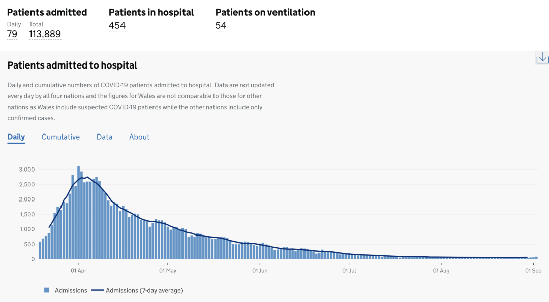 9月5日数据:目前住院的确诊新冠患者454人(*),累计住院新冠患者总数为113,889人(*)。