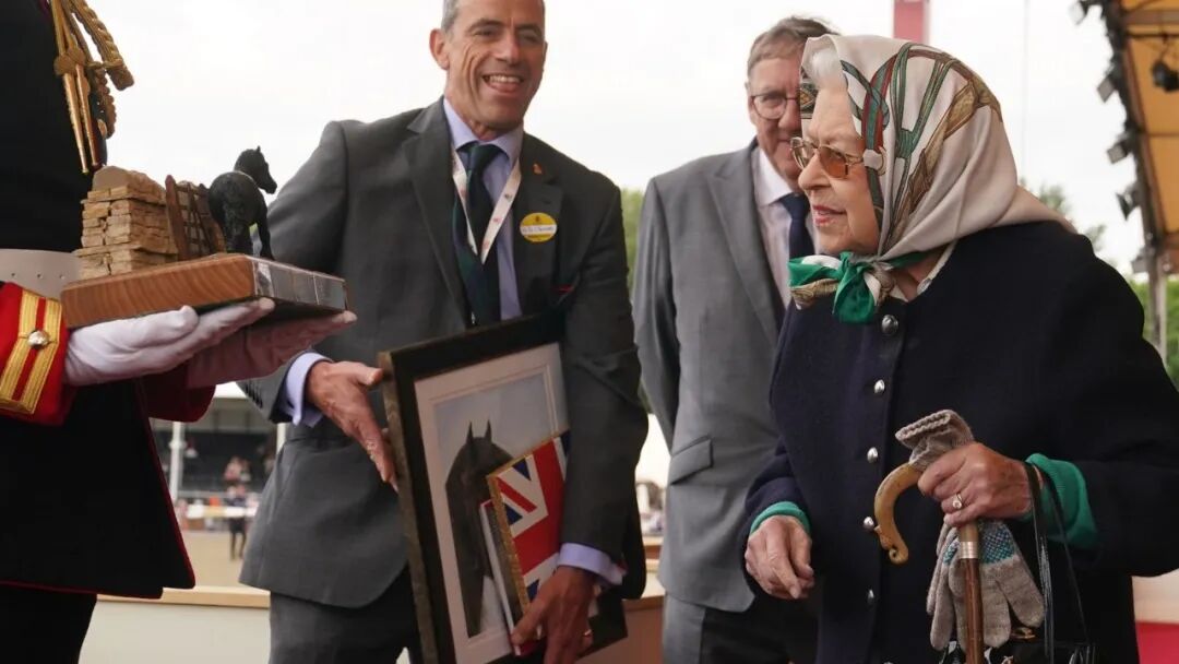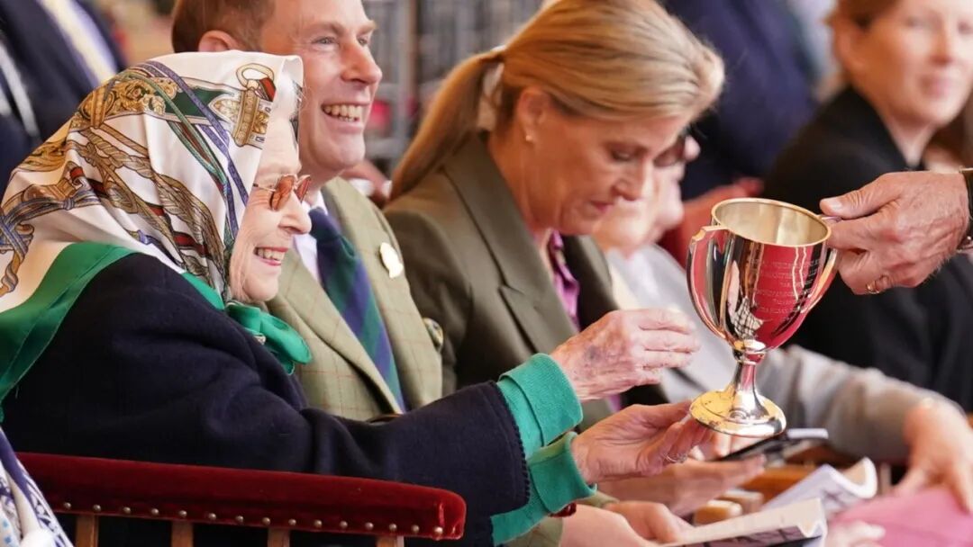 女王的马Balmoral Leia被评为此次皇家温莎马展的冠军,该活动在城堡内举行。女王后来在接受金杯时显得很高兴。