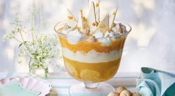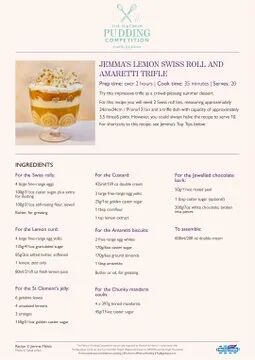 来自默西塞德郡Southport的文案人员Jemma Melvin用一款柠檬瑞士卷杏仁饼布丁(Lemon Swiss roll and amaretti trifle)击败了其他约5,000名参赛者。