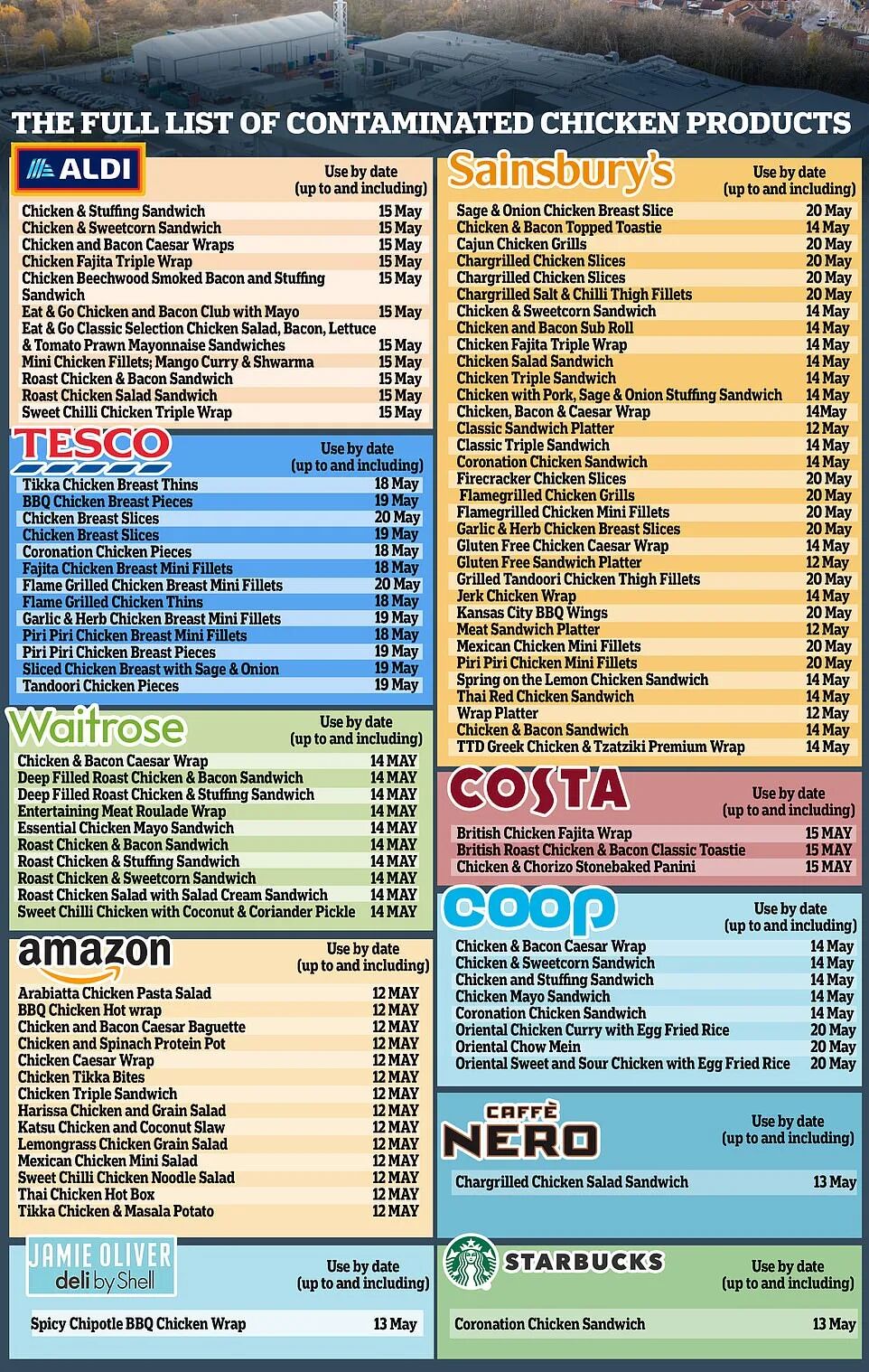 食品标准局(UKFSA)的官员5月13日(周五)发布了一份据信怀疑已被感染的产品综合清单。涉及12个不同品牌,包括超市、咖啡店和便利店。除了Tesco、Aldi和Sainsbury's已经发布召回清单外,UKFSA还列出了来自亚马逊Amazon Fresh、Costa、星巴克和One Stop的产品。