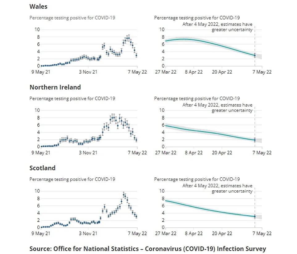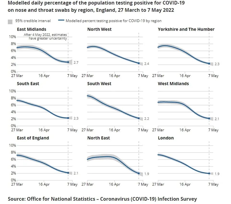 国家统计局(ONS)截至5月7日一周内的最新估计数据显示,英国新冠感染率持续下降,处于2021年12月中旬以来的最低水平——约148万人检测结果呈阳性,为每45人中有1人感染。