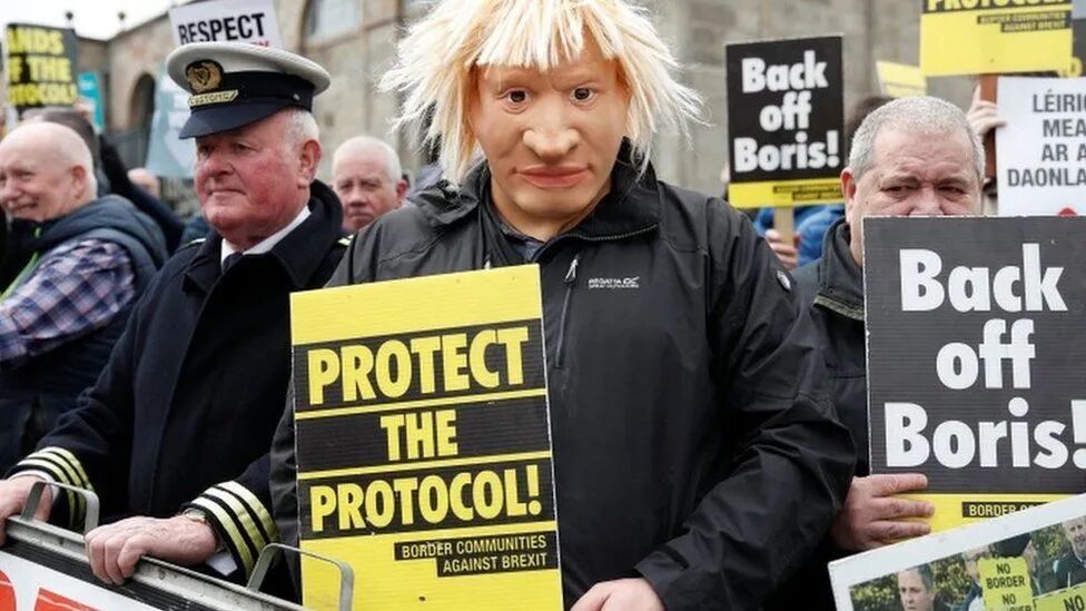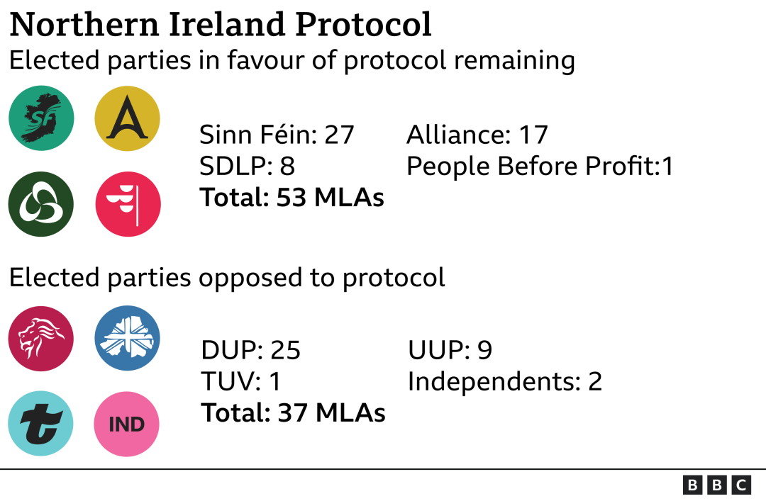 近日,北爱尔兰的民主统一党DUP因为《北爱尔兰议定书 Northern Ireland Protocol》而拒绝进入英国议会。该议定书旨在确保英国脱欧后爱尔兰与英国北爱地区的陆地边界自由贸易继续进行,却反过来增加了英国本岛和北爱尔兰之间流动货物的额外检查。