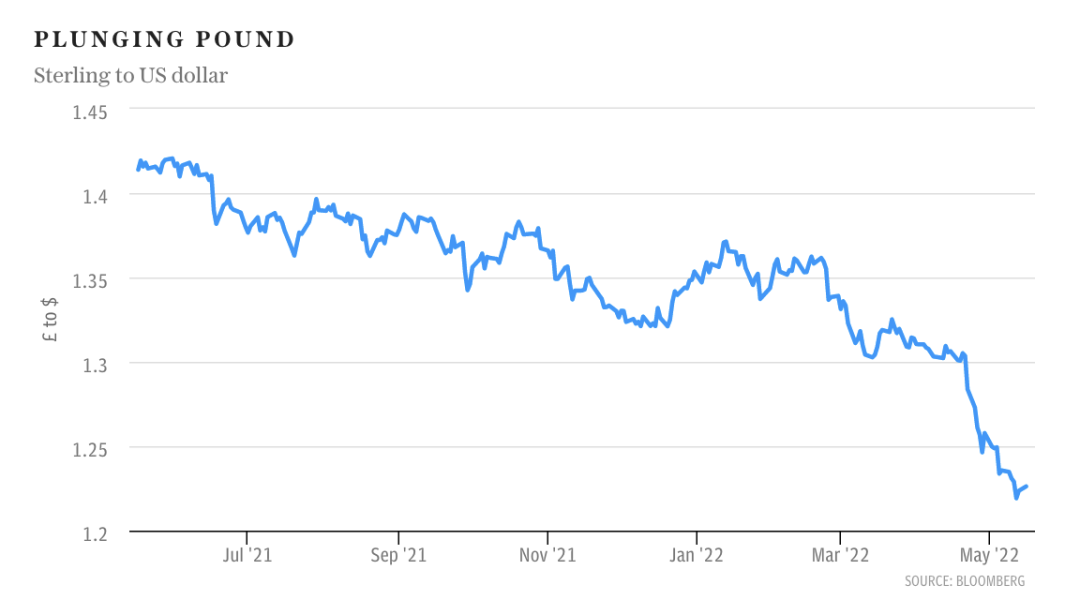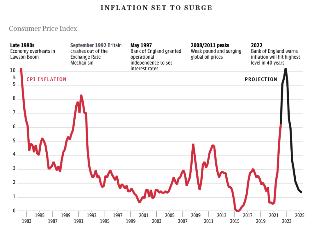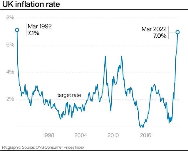根据英格兰银行的数据显示:4月份的通货膨胀率超过了9个百分点,预计到今年年底通货膨胀率将达到两位数,而上一次超过10%还是40年前。