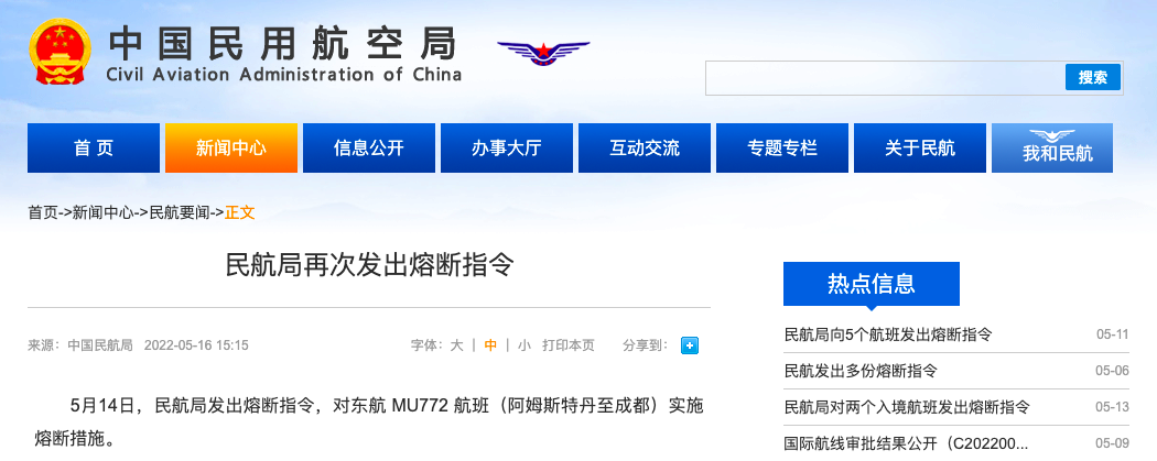 民航局5月16日(周一)发出熔断指令,对东航MU772航班(阿姆斯特丹至成都)实施熔断措施。