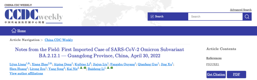 据《中国疾病预防控制中心周报》(China CCDC Weekly)5月16日报告,中国广东确诊首例Omicron变种BA.2.12.1型亚株境外输入感染病例。该名感染者为27岁男性,于4月23日从肯尼亚内罗毕抵达广州白云国际机场。