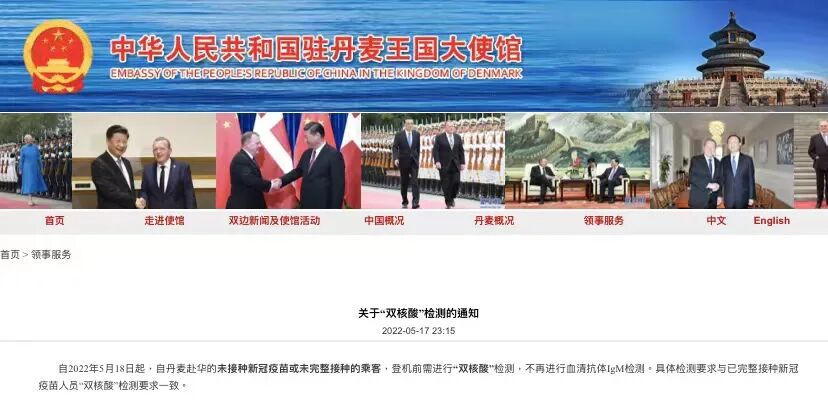 自5月18日起,丹麦赴华的未接种新冠疫苗或未完整接种的乘客,与完整接种新冠疫苗人员要求一致,登机前进行“双核酸”检测,取消血清抗体IgM检测。没有要求航班起飞前7天首次核酸检测。