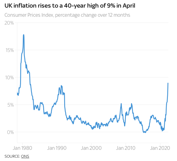 在生活成本危机不断恶化的情况下,英国4月通货膨胀率已飙升至9%,达到自1982年有数据以来40年最高水平。