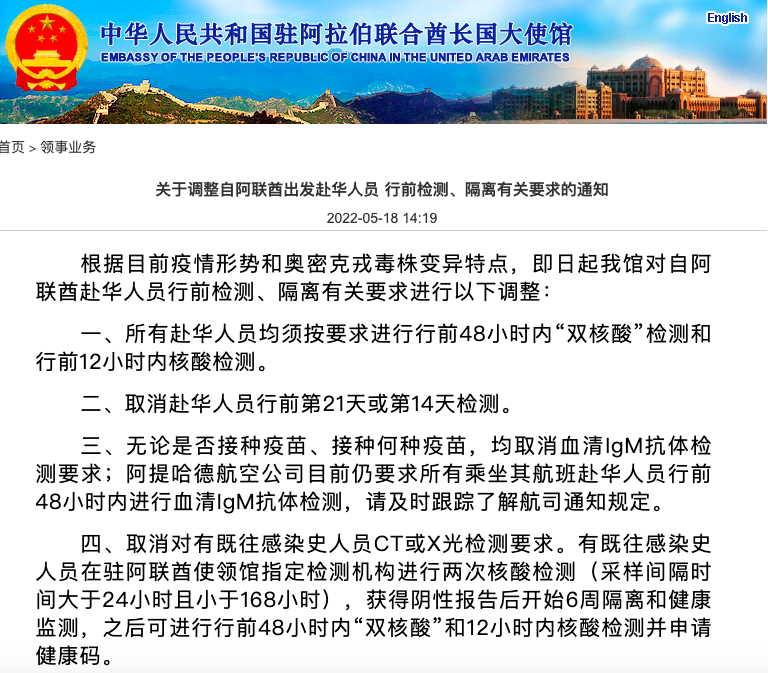阿联酋赴华人员从5月18日起,取消行前第21天或第14天检测;取消血清IgM抗体检测(阿提哈德航空公司除外);取消对有既往感染史人员CT或X光检测要求。
