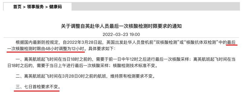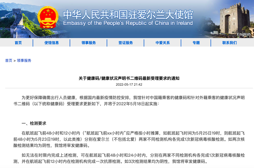 在驻爱尔兰大使馆的最新要求中,强调航班起飞前48小时和12小时内的“双核酸”检测或48小时和24小时内“双核酸”检测+12小时内的抗原检测。