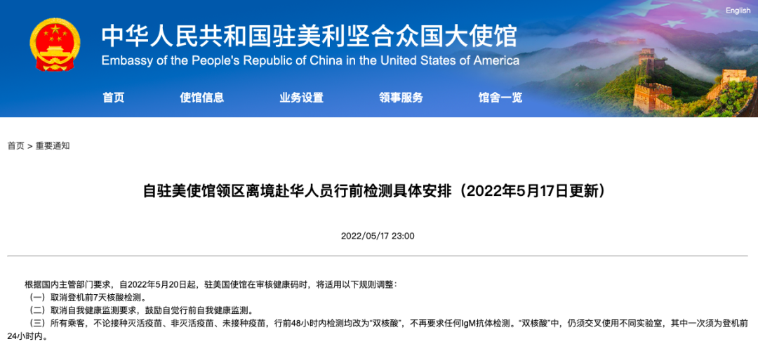 中国驻美国大使馆5月17日更新赴华行前检测具体安排: