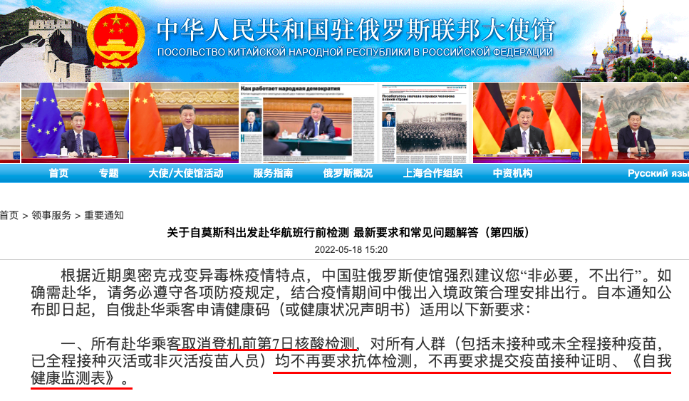驻俄大使馆声明中表示,所有赴华乘客从5月18日起: