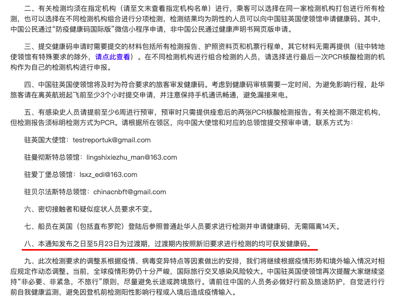 据驻英国大使馆5月19日(周四)发布的 申请健康码最新规定 通知,即日起,自英赴华人员 无需再进行