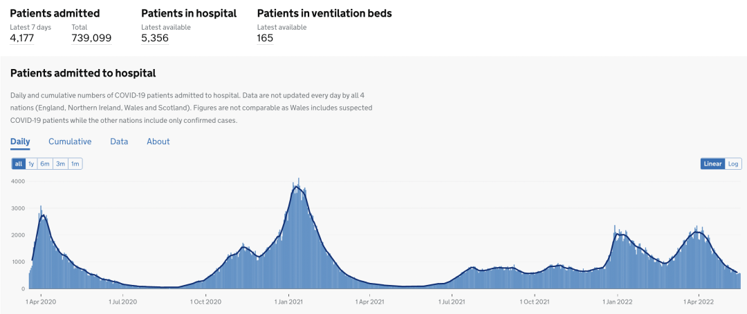 5月19日数据:目前住院的确诊新冠患者5,356人,累计住院新冠患者总数为739,099(+4,177)。