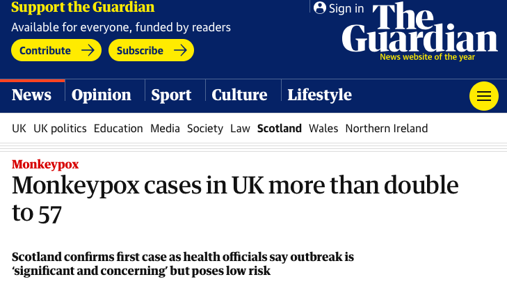 根据英国卫生安全局(UKHSA)5月23日(周一)更新的数据,在苏格兰报告首例确诊猴痘病例后,英格兰地区新记录了36例猴痘病例。自5月7日以来,英国确诊猴痘病例总数达到57例。