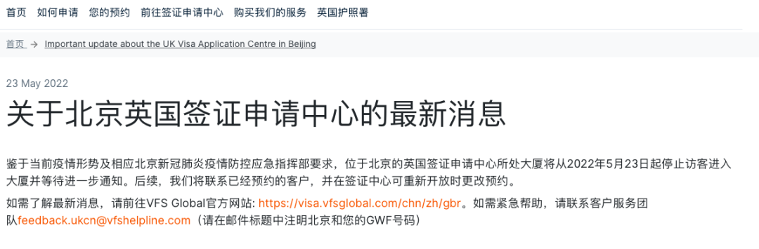 据北京英国签证申请中心5月23日(周一)发布的最新通告,鉴于当前北京疫情形势及相应疫情防控要求,VFS Global北京英国签证申请中心将从2022年5月23日起暂时关闭,开放时间需待进一步通知。