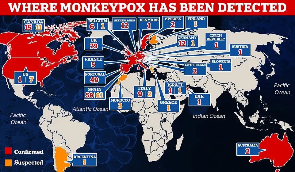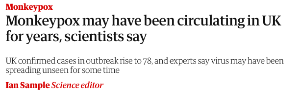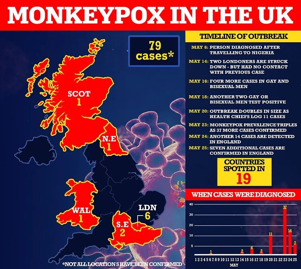 b。英国确诊猴痘感染病例80例;科学家怀疑猴痘病毒早已在英国/欧洲隐匿传播