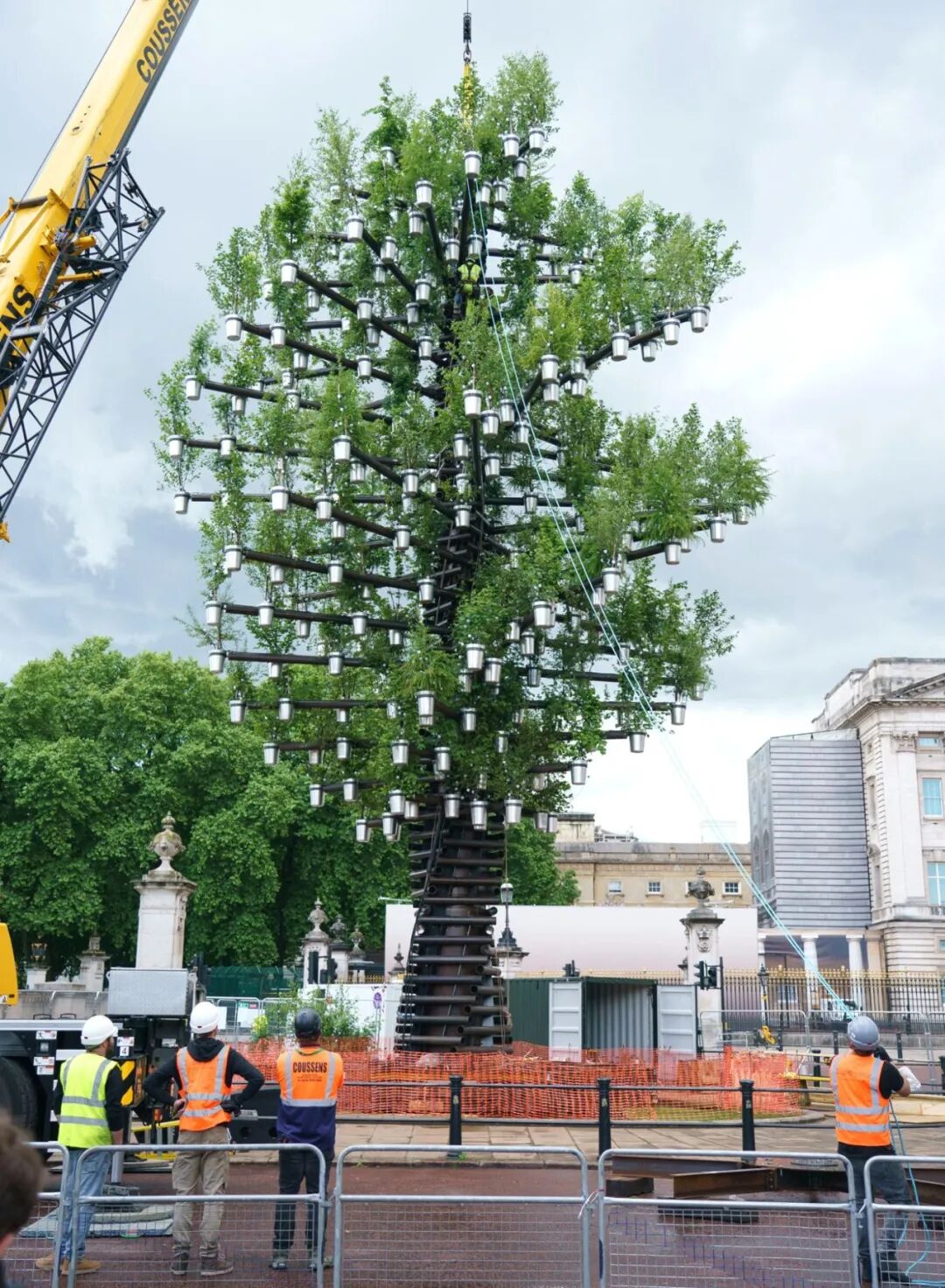 王室成员抵达现场,共同点亮一棵21米高,专为女王白金禧年打造的“树中之树”艺术装置雕塑。