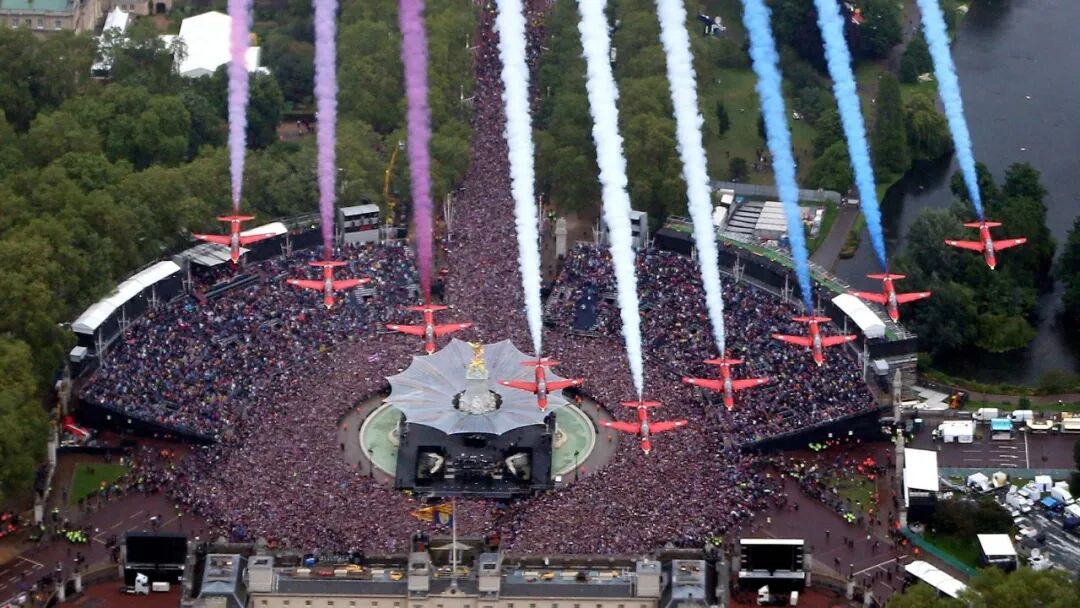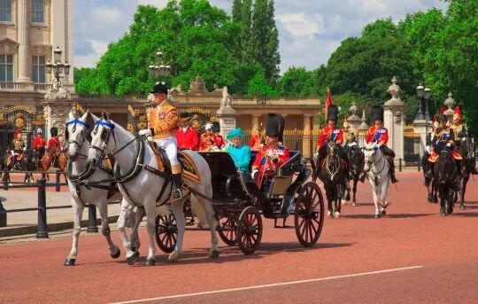 王室成员离开白金汉宫前往阅兵场。女王及其他王室成员将“阳台亮相”Balcony Appearance,一同观看一场特别的飞行表演。