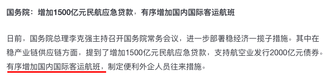 在日前举行的国务院常务会议上,针对航空方面,将增加1,500亿元民航应急贷款,支持航空业发行2,000亿元债券。并提到将有序增加国内国际客运航班,制定便利外企人员往来措施。