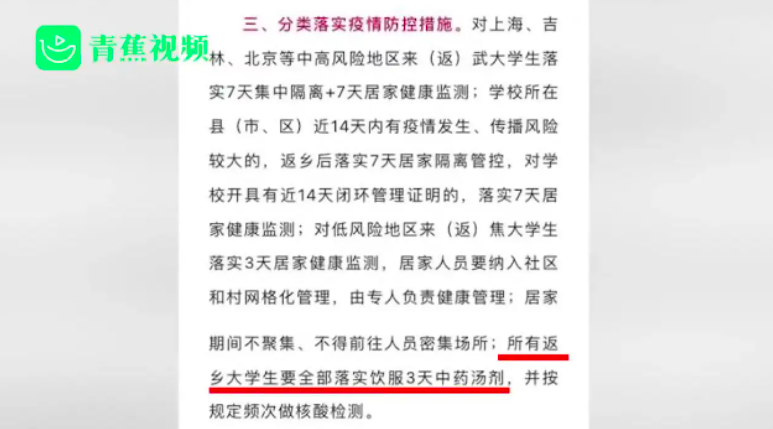 5月25日,河南焦作武陟县融媒发布给返乡大学生的一封信中写道,“所有返乡大学生要全部落实饮服3天中药汤剂”。对此当地工作人员回应称,这是政府的“优惠措施”,以起到预防作用。为了防疫安全,药发到手里为自愿服用,对身体也没有伤害,并表示会向有关部门建议反馈。