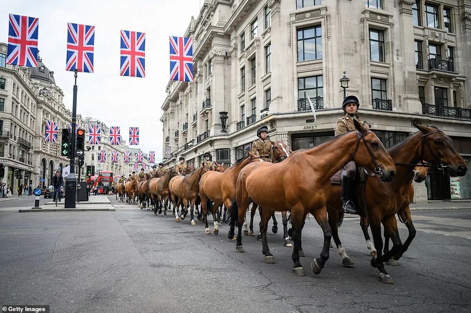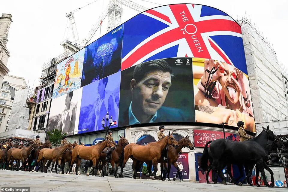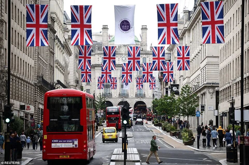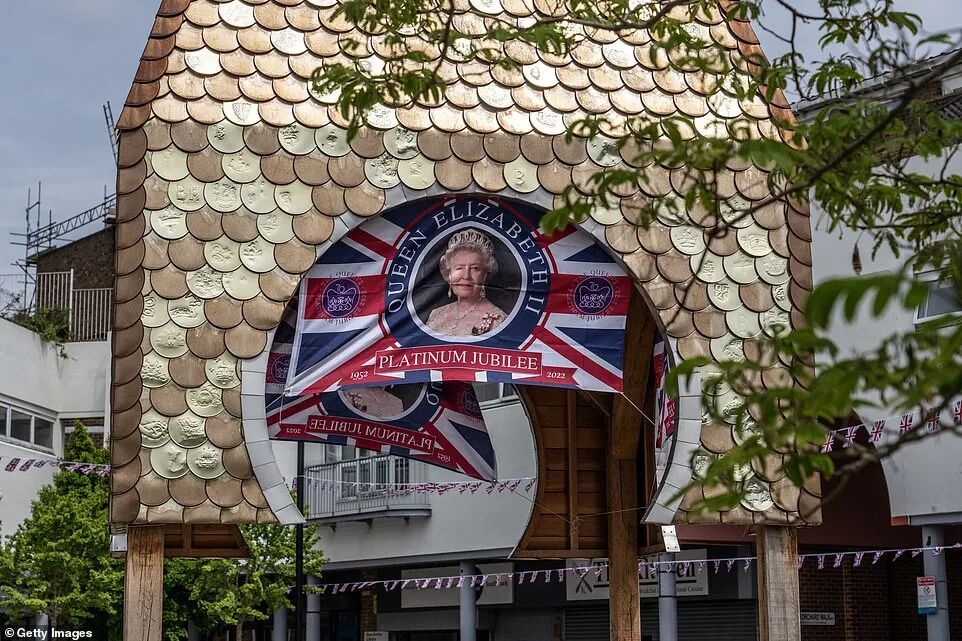 c。女王返回伦敦为庆典做准备,大街小巷挂满白金禧年装饰,王室成员将在周末访问英国各地