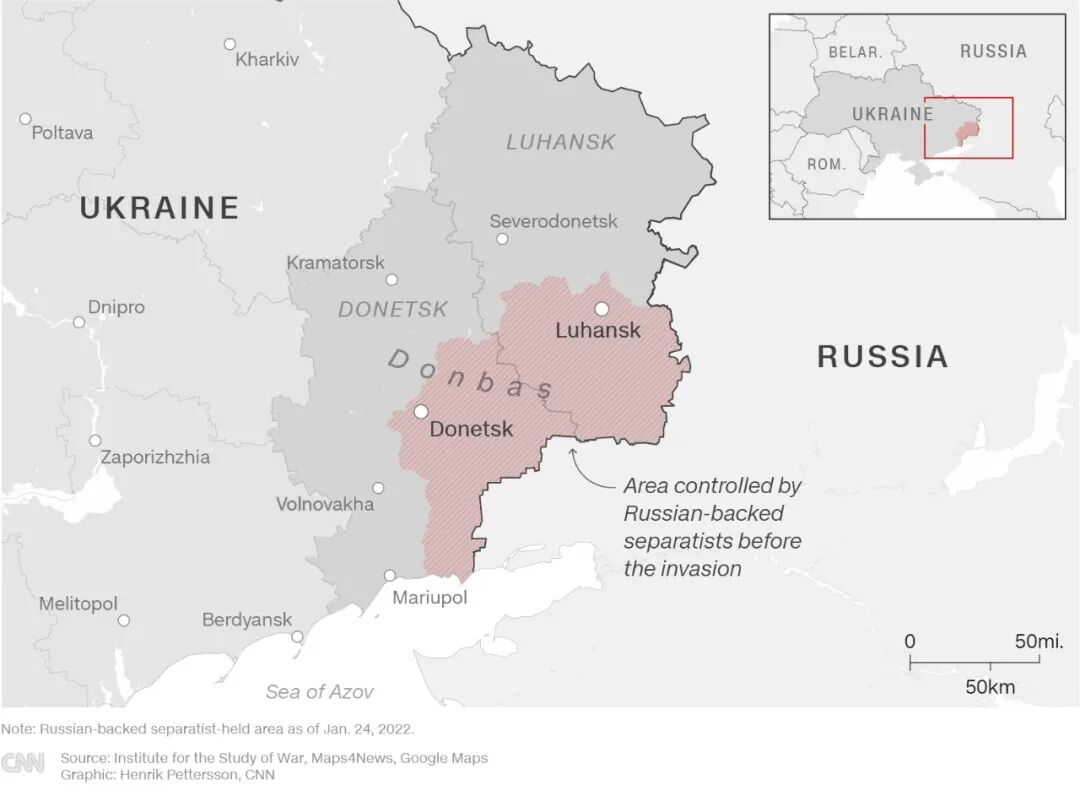 俄乌冲突现在的战斗集中在顿巴斯Donbas地区,该地区覆盖了乌克兰东部的大部分地区,自2014年以来一直是俄乌冲突的关键地区。