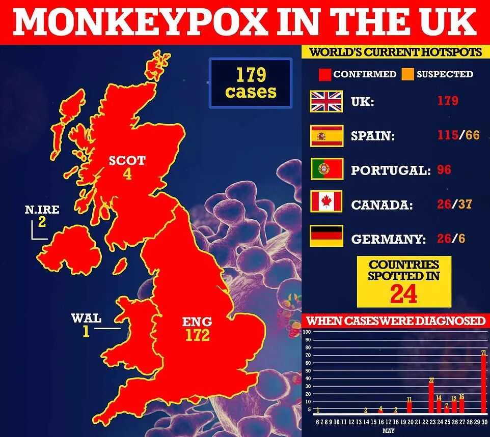 a。英国猴痘病例确诊179例,美国发现首批人际传播猴痘病例