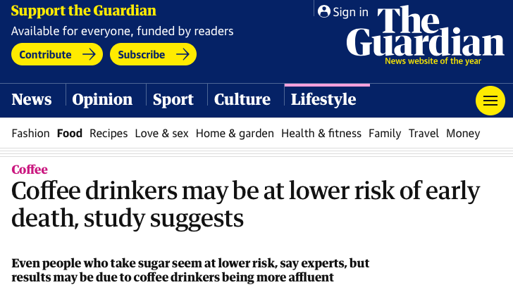 格拉斯哥大学代谢医学教授Naveed Sattar表示,这一结果“耐人寻味,但并不具有确定性”。“喝咖啡的人一般来说比不喝咖啡的人更富裕,更注重生活,显然这些因素难以在观察性研究中被克服“。