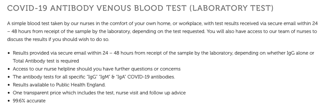 一般来说,英国大部分正规私立诊所都可以做抗体检测,但一定注意!大使馆要求48小时内做血清IgM抗体检测!所以该诊所给出的Antibody test针对抗体类别中包含血清IgM。不要迷糊做成了另一个~