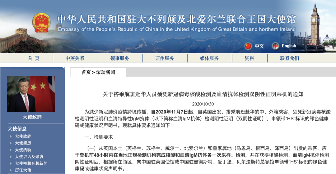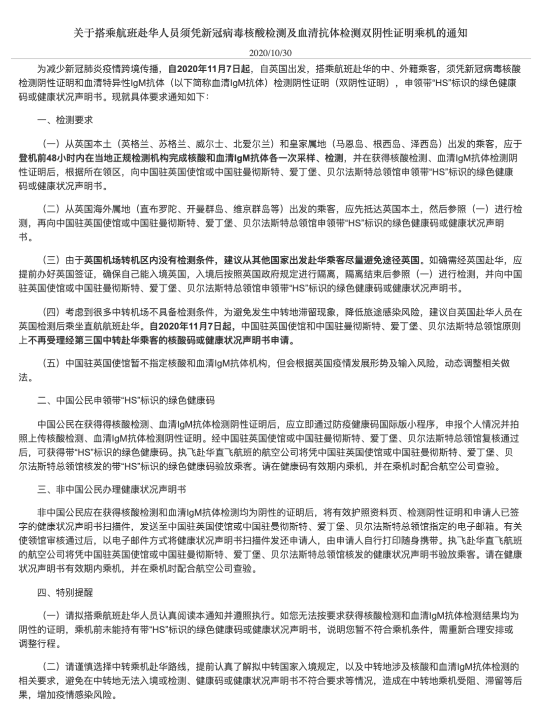 10月30日(周五)大使馆更新:为减少新冠肺炎疫情跨境传播,自2020年11月7日起,自英国出发,搭乘航班赴华的中、外籍乘客,须凭新冠病毒核酸检测阴性证明和血清IgM抗体检测阴性证明(双阴性证明),申领带“HS”标识的绿色健康码或健康状况声明书。