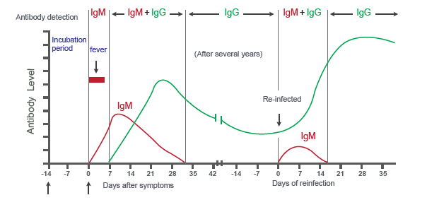 但抗体IgM维持时间短,仅几日~几周。在IgM消失过程中,抗体IgG出现并达到含量峰值,并在血中持续数月~数十年。