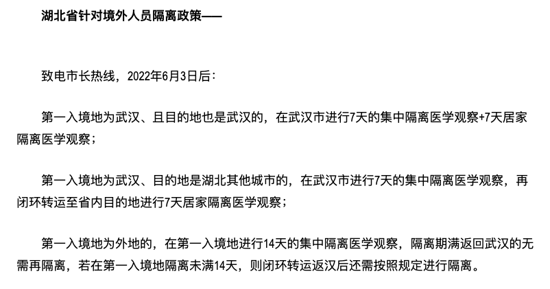 “14天”——在第一入境地进行14天集中隔离,隔离期满返回武汉的无需再隔离;若在第一入境地隔离未满14天,则闭环转运返汉后还需按照规定进行隔离。