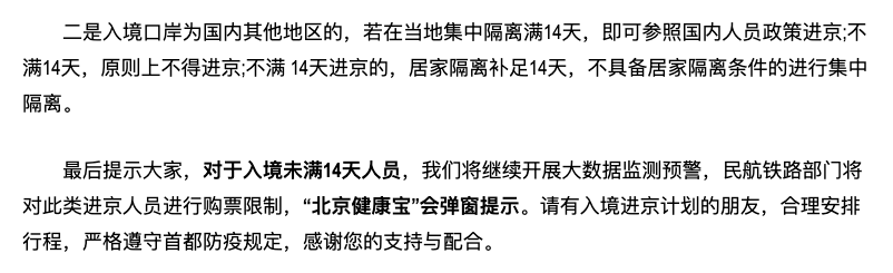 不符合以上条件,目的地为省外者,还需按照此前规定进行——若在当地集中隔离满14天,即可参照国内人员政策进京;不满14天,原则上不得进京;不满14天进京的,居家隔离补足14天,不具备居家隔离条件的进行集中隔离。