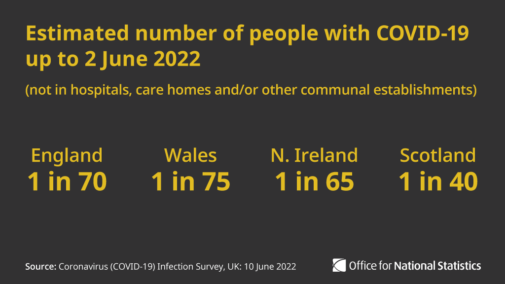 尽管国家统计局将苏格兰和威尔士的感染率变化趋势描述为“不确定”,但估计所有英国四个地区的感染率都有所上升。截至6月2日,各地区感染率为:
