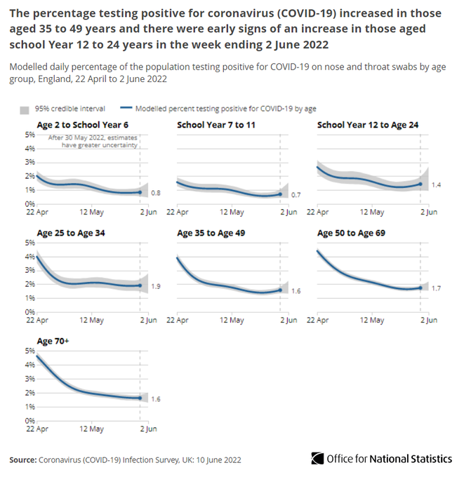 根据国家统计局(ONS)发布的数据,在截止6月10日(周五)的过去一周里,英国有近99万人新冠病毒检测呈阳性,比上周约95.4万人有所增加(4%),3月以来首次出现上升。