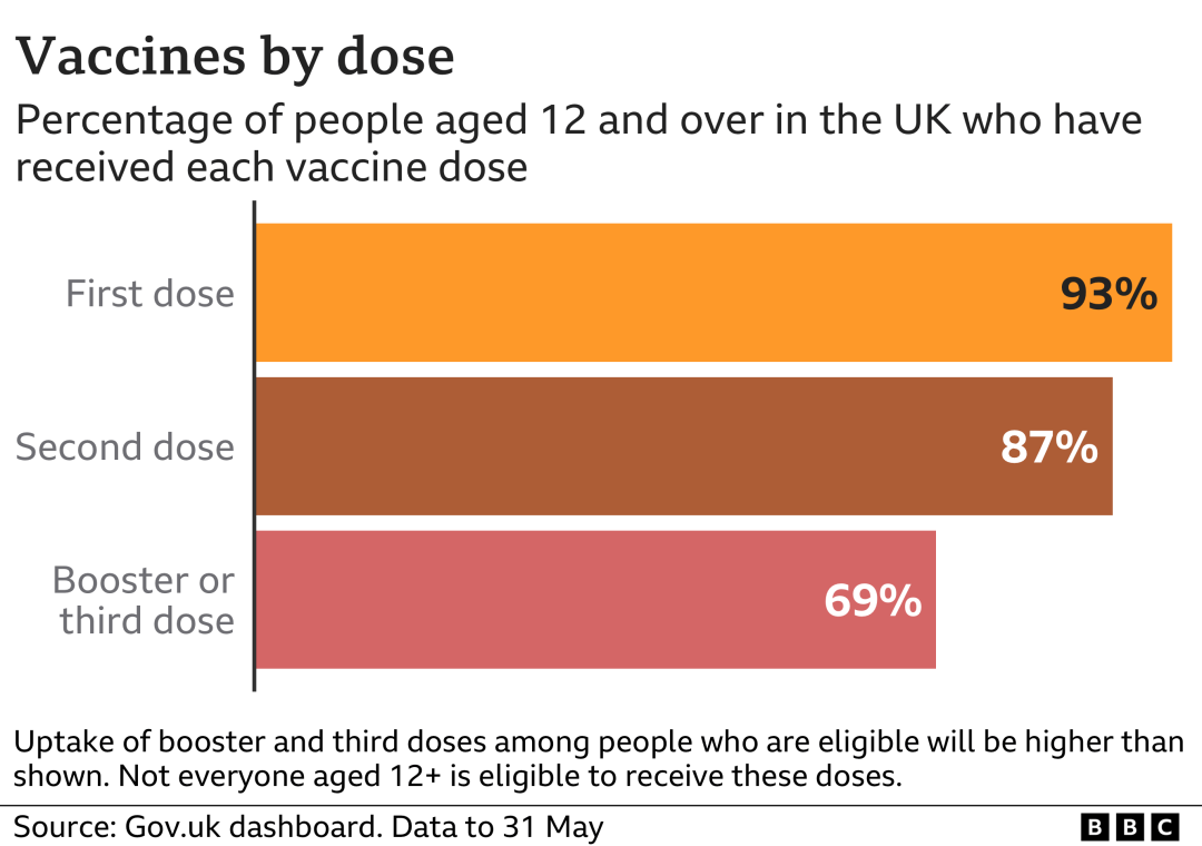 超过5,300万人,约占英国12岁及以上人口的93%,已经接种了第一剂量疫苗。完成第二剂疫苗接种的人数超过5,000万,占12岁及以上人口的87%。接种加强剂疫苗超过3,900万支。